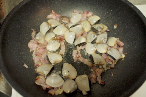 3) 加入蜆略炒, 再加入白酒, 蓋好蓋煮約3分鐘。