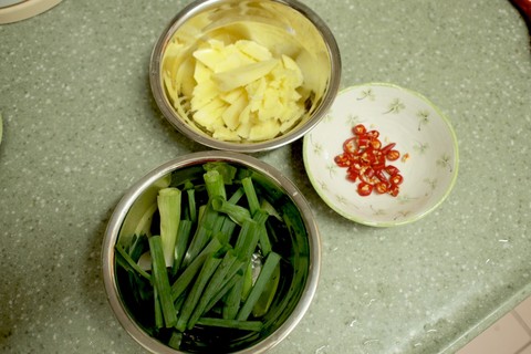 2) 薑去皮, 用刀拍扁; 蔥洗淨, 切段; 指天椒切細粒。