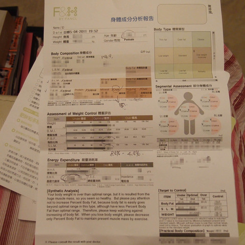 另一個測試就是身體成份分析, 這個我比較關注。現在貼出來的報告, 給我打了格仔, 因為實在太私人了, 而且亦都不是標準身型, 無謂坦蕩蕩地POST出來嚇大家了, 哈哈~ 說回正題, 當然見到報告時, 真的讓我很驚訝, 因為實在太詳細了, 絕對要讚!! 首先, 我發現自己比之前重了很多, 大鑊了! 第二, 可幸的是身體很多地方都ON AVERAGE, 不是太大問題; 不過體內水份過多, 即外間一般稱為「水腫」, 還有脂肪量亦都超標。[慘] 其實水腫也不無道理, 我這個人雖然經常下廚, 不算太多在外吃飯, 但就太喜歡吃濃味的東西, 結果搞到現在水腫, 其實一直都知道問題, 不過就是不懂得怎樣去處理。也只是常去做按摩的地方, 偶爾做返一PART兩PART通淋巴的, 以為可以解決水腫問題。健康顧問則教我, 其實通淋巴不是完全沒有用, 不過亦需配合適當的飲食, 才能事半功倍。例如平常吃要吃得清淡一點, 自己煮東西也不要放太多鹽, 另外可多吃一些海藻類的食物, 也可以幫助掛走多餘的水份, 從而解決水腫問題。