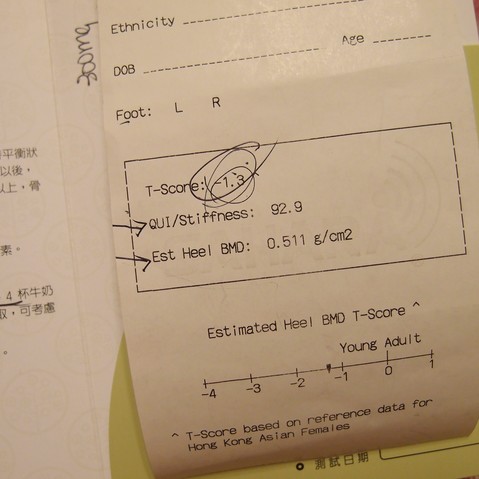 做完三個TEST之後, 健康顧問拿著我的報告再跟我逐一解說。幸好, 我的問題也不算太多, 血壓正常; 可是在骨質密度測試結果我是屬於高風險有可能患上骨質疏鬆的一群。健康顧問說因為我還年輕, 還有時間可以去改善這個問題, 首先她了解我的飲食習慣, 發現我平常吃的食物, 一般都不含太多的鈣質。於是她建議我可以多飲牛奶,豆漿或芝士, 不過亦有另一方法, 就是進食鈣片supplement, 這樣補充得比較快~