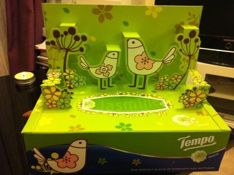 現在什麼都說要3D, 連TEMPO盒裝紙巾在包裝也加上3D的設計~ 在盒上沿著虛線撕開, 就能見到一個好有春天感覺的花園, 還有兩隻天堂鳥在中間… 很RELAX的感覺!! 放在家中當作擺設也很不錯, 很配合春天喔!