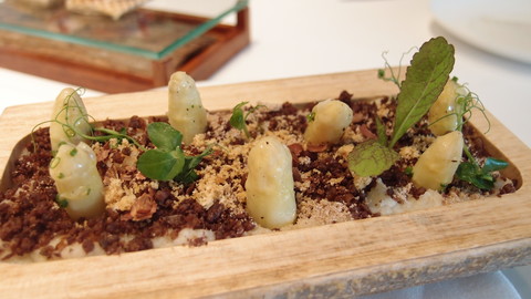 現在的時候, 是吃白露荀最時令的季節, 所以特別點了這個新推出的白露荀菜式, 叫做Field, 看上去整個Presentation, 大家說像不像一塊田原呢?!! 最面層像火箭般插上一支支矜貴的白露荀, 底層白色看上去有點像薯蓉的東西, 吃了一口後, 先覺得自己「諗錯晒」。原來是白露荀蓉來的, 從沒想過那麼矜貴的東西做成蓉呢。 上面啡色的是用黑麥麵包磨成碎再跟乾黑橄欖碎以橄欖油烘焗而成的, 聞起來是非常香濃的橄欖味, 跟白露荀蓉一起吃, 格外可口, 提升了白露荀的鮮味!!!