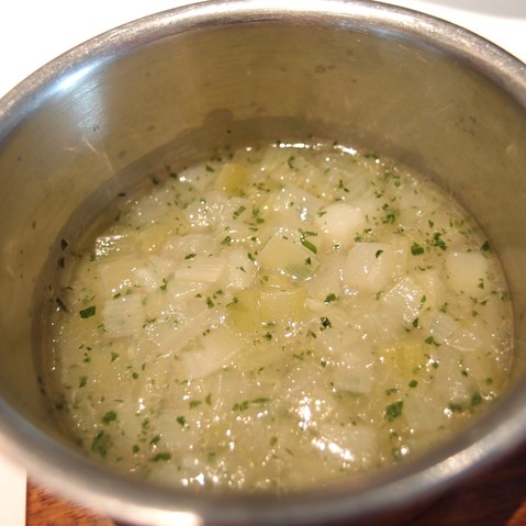 Sauce是分開serve的, 用超濃的魚汁跟薑煮成~ 將比目魚跟椰菜花佐以魚汁吃, 味道層次感大增!!