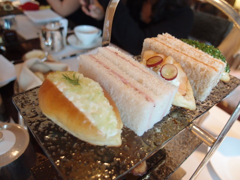 最高一層是finger sandwiches… 我最喜歡是最左邊的忌廉芝士青瓜三文治和最右邊的蛋沙律三文治, 兩款三文治吃完都不會覺得膩。(其實我通常都會揀一些感覺比較清新的三文治來吃, 最少吃完不會太膩而吃不下之後的甜點)