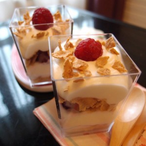 5)    將乳酪忌廉放入唧袋, 先唧一層乳酪忌廉到杯中, 再加入紅桑子及發芽米片, 再唧入一層乳酪忌廉, 隨意加入發芽米片及紅桑子在最面層作裝飾, 再放入雪櫃約兩小時, 即成。