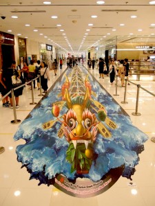這幅全球最長的3D龍舟立體畫 – <龍騰香江>, 全長60.46米, 可讓60人同時坐在畫上面拍照,而拍出來的照片,尤如坐在真的龍船上一樣, 超立體的! 單看我這張照片, 其實也可大致看到龍鬚有點立體呢~ 這幅畫的大約位置在海運大廈近Al Molo及BLT對出一帶, 展期至6月19日。