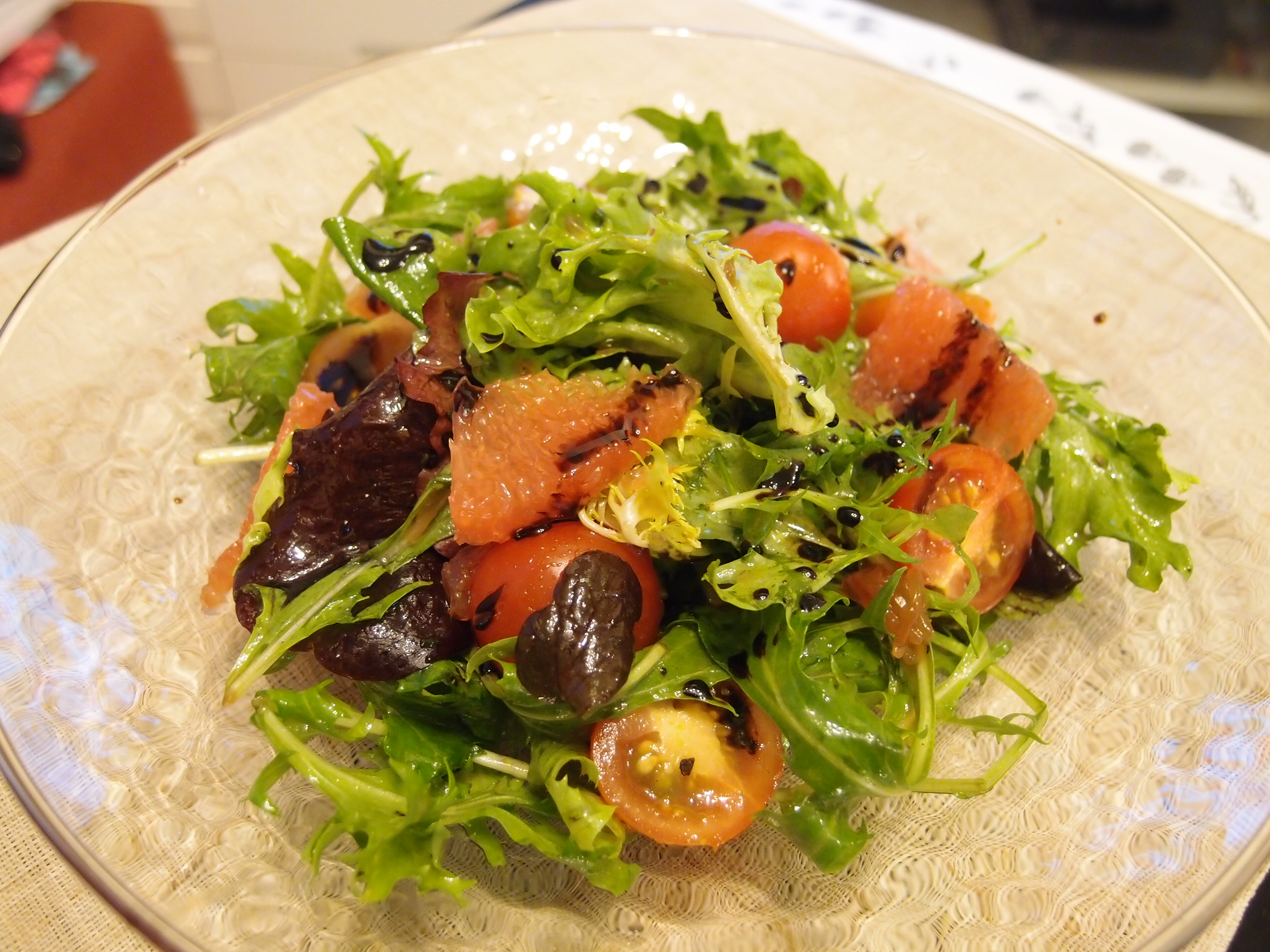 1) 將沙律菜及番茄仔置大碗, 加入牛油果油, 意大利黑醋, 西柚皮, 西柚肉 海鹽及黑胡椒碎拌勻。