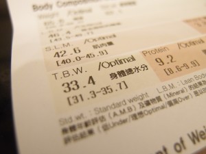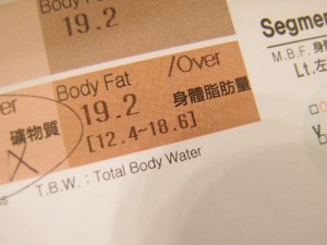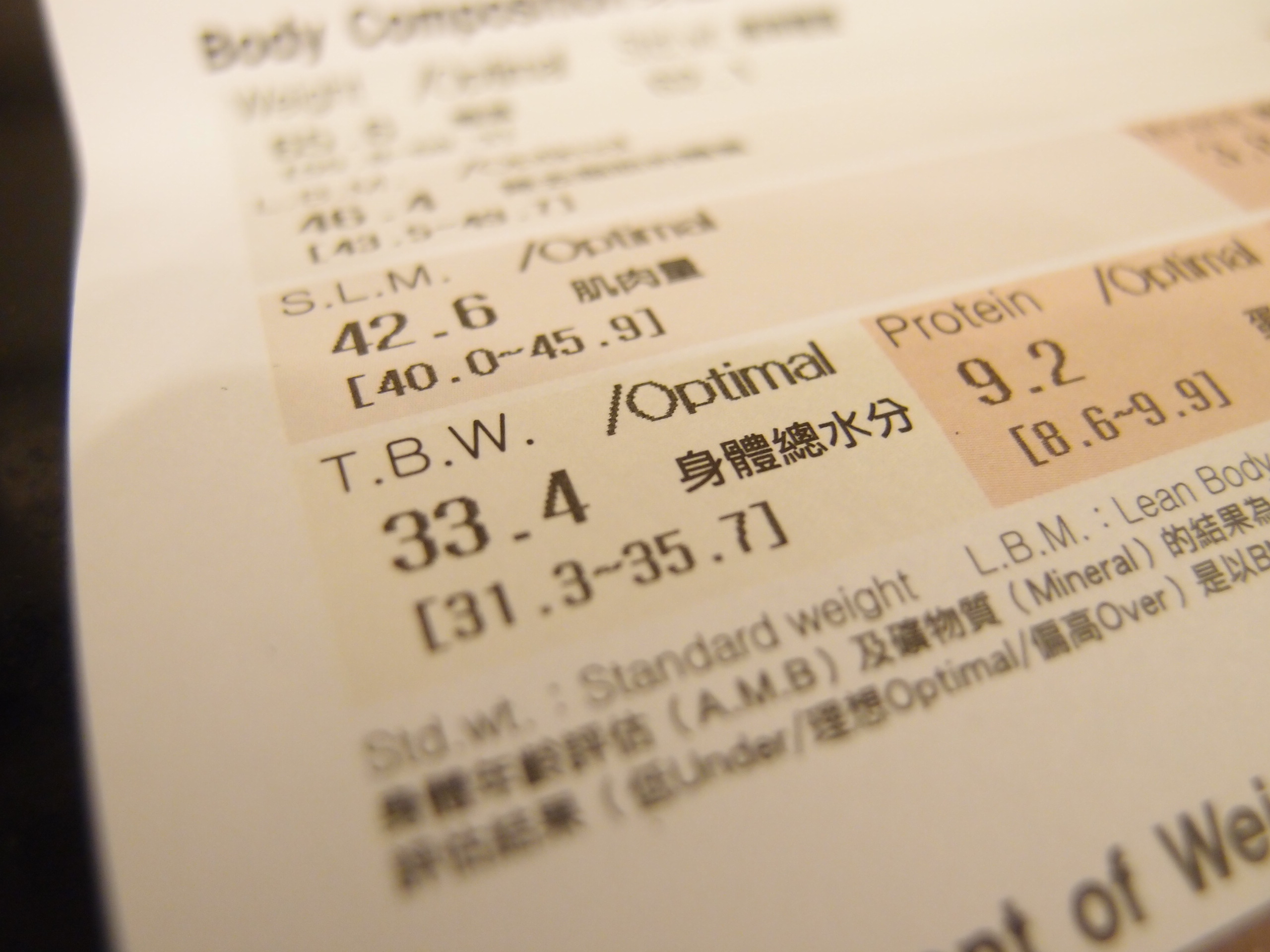 測試後, 報告指出我身體內的水份約有33.4%, 雖然說是在正常範圍, 但如果可以再降低一兩個Percent, 就更加完美;