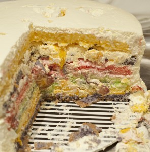 切開蛋糕後, 見到的是很多層不同顏色的海綿蛋糕及鮮果, 像極一條彩虹, 很繽紛的感覺呢!~ 裡面是4層蛋糕 (橙色, 粉紅色及綠色是普通的牛油蛋糕, 而紫色的是芋頭味的蛋糕), 另外3層生果有士多啤梨, 奇異果和桃, 底層是脆脆~