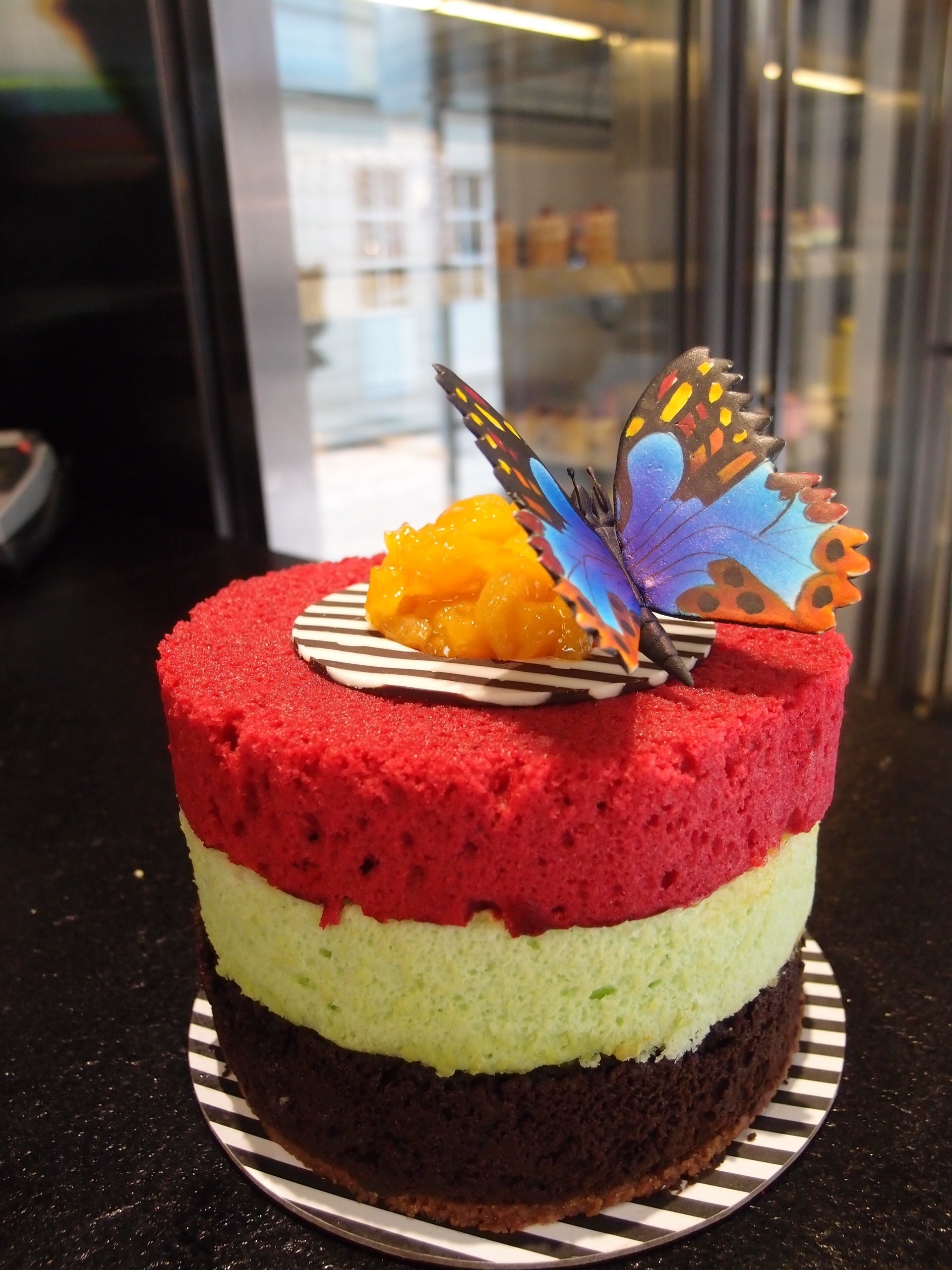 後來過了幾天是朋友生日, 我們又訂了另一個Madame Butterfly (HK$580/500克) 給兩位壽星~ 這個外表看上去是三層不同的鮮艷奪目的顏色, 很eye catching呢~ 三層是口感很軟很有蛋香的雪芳蛋糕, 紅色是Beetroot味, 本身我對紅菜頭都不是特別喜愛, 但用來做蛋糕都幾特別; 綠色是開心果味, 味道有點淡, 開心果味不夠濃; 黑色則是濃濃的朱古力味道, 中間的糖漬杏桃的酸味, balance了朱古力的味道, 要讚是最底層的脆脆, 很香口!!!