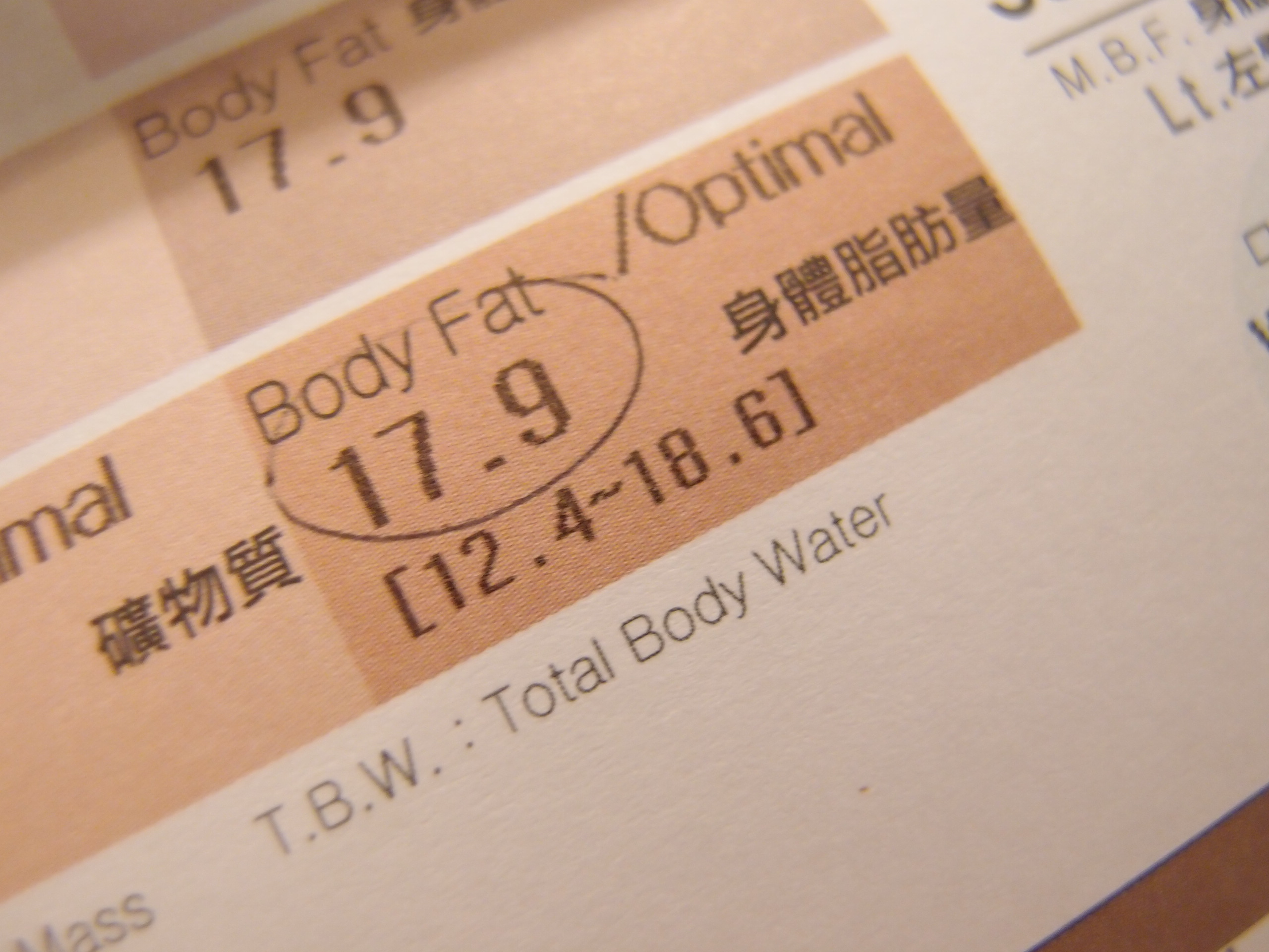 一個半月前, 我的身體內的脂肪百分比是19.2%, 是OVER了的!! 今次我再去做測試, 百分比竟然是17.9%, 足足下降了1.3%!!! 這個成績, 令人鼓舞呢!!