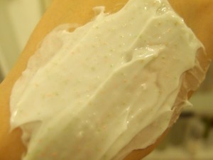 Herb mask貿地幾厚,要用一點力才可推開。當中有一些不同顏色的磨沙粒子,感覺幾colourful,幾得意呢~ 原來這些磨沙粒子也有不同作用的。綠色的能軟化角質,透明的是祖祖巴粒子可去除老化角質,而粉紅色的可以滋潤皮膚及具保濕功效。