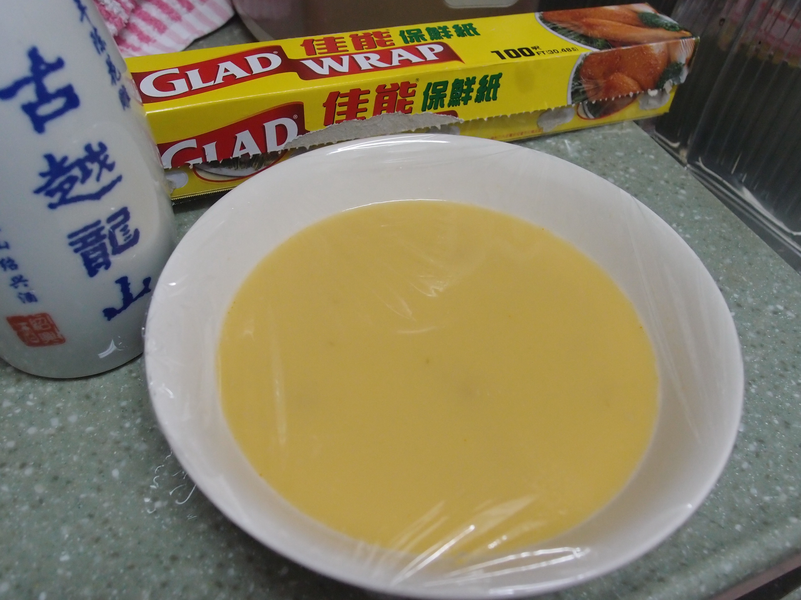 小貼士: 蒸蛋前用保鮮紙將器皿包好,可以在蒸的過程中, 減少表面氣泡造成, 使蒸出來的蛋更光滑。