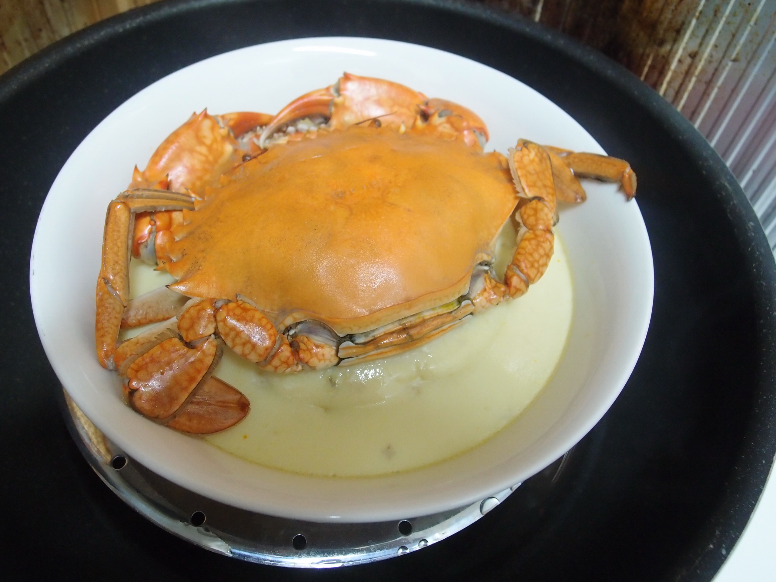 1) 先將蟹洗淨, 不用斬件, 放在碟上, 將2湯匙的花雕酒淋在蟹身上, 隔水大火蒸至8成熟, 備用。