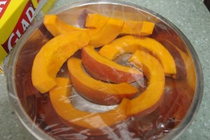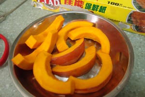 4)將已切件的南瓜放在碟上,用保鮮紙包好,隔水蒸15分鐘。
