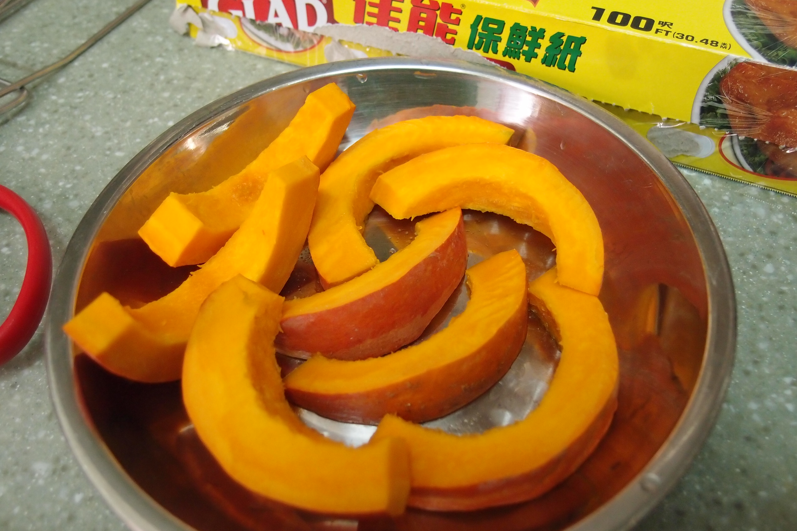 在蒸南瓜前,用保鮮紙包好,這樣可以將南瓜的水份鎖好,避免在蒸的過程,南瓜失去水份變得乾身。