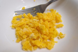 3)已熟的咸蛋剝殼,只取咸蛋黃,再用叉子將咸蛋黃壓碎,備用。