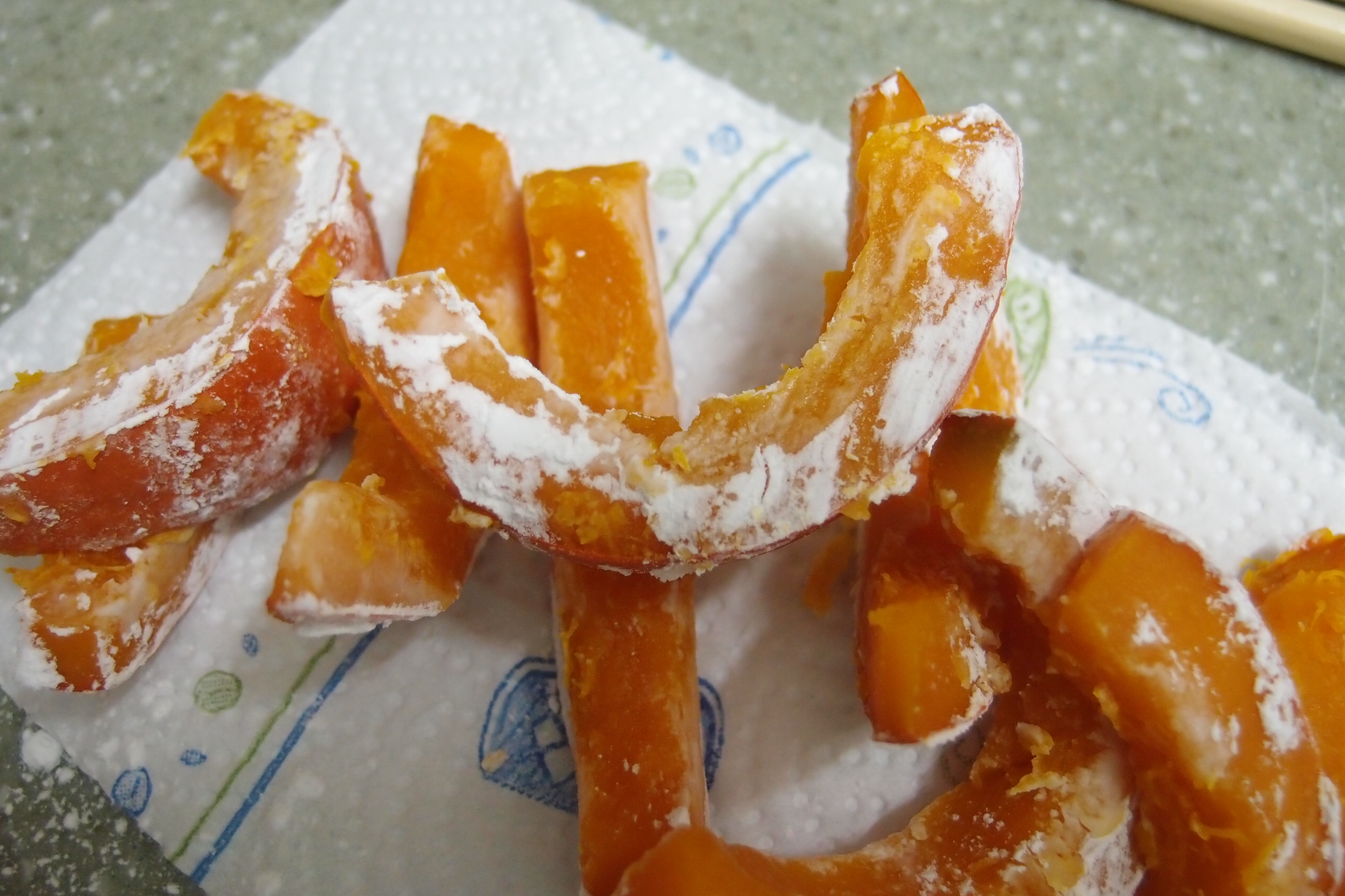 5)用紙巾將已熟的南瓜表面水份吸乾。