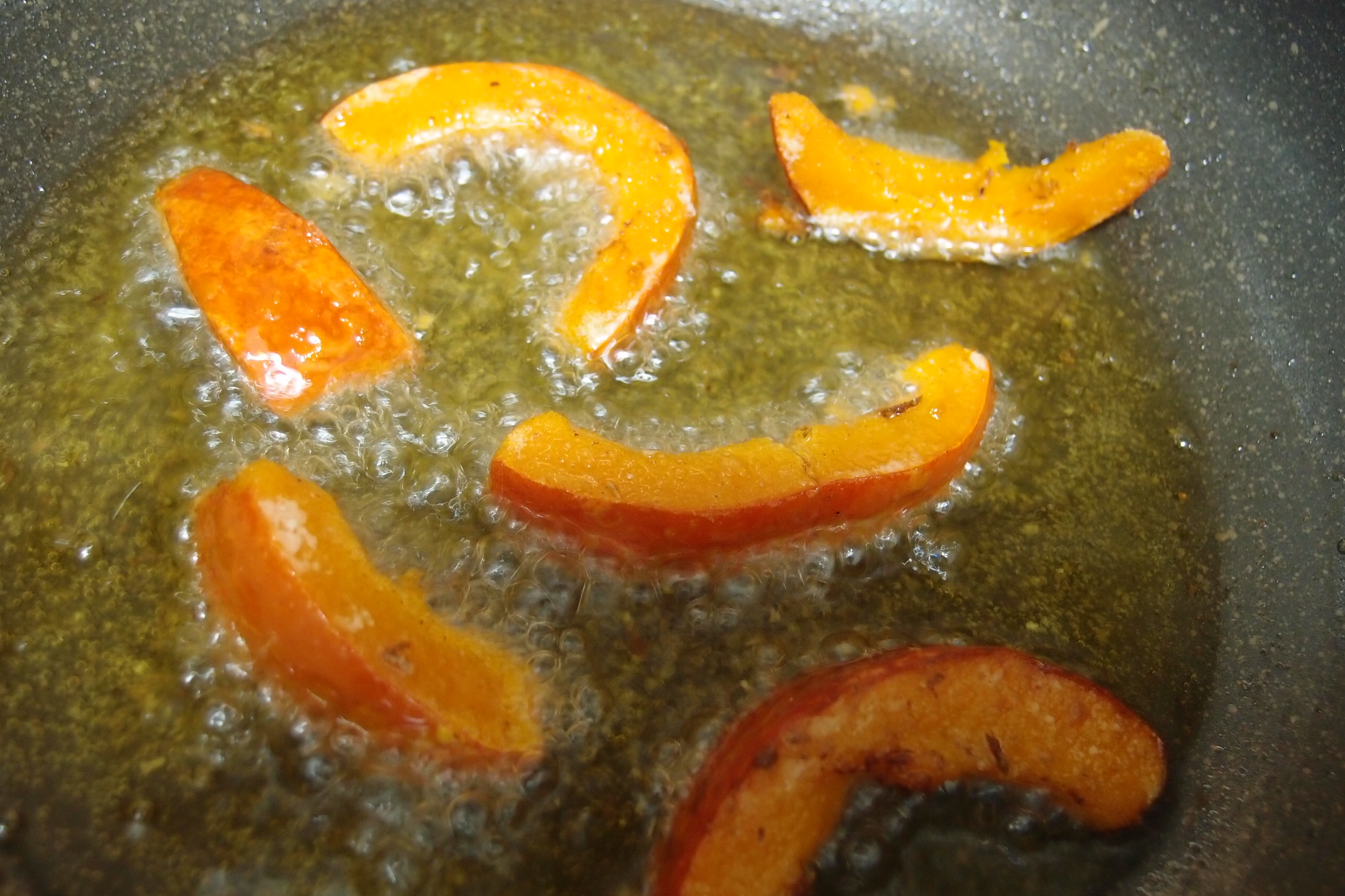 7)以半煎炸的方法,將南瓜炸至金黃色,盛起,隔油。