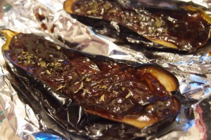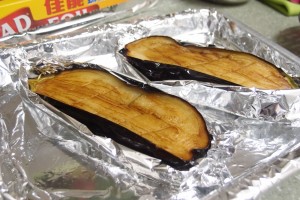 6)預熱焗爐150度;用錫紙鋪在焗盤上,將茄子置在焗盤上,放入焗爐焗10分鐘,即成。