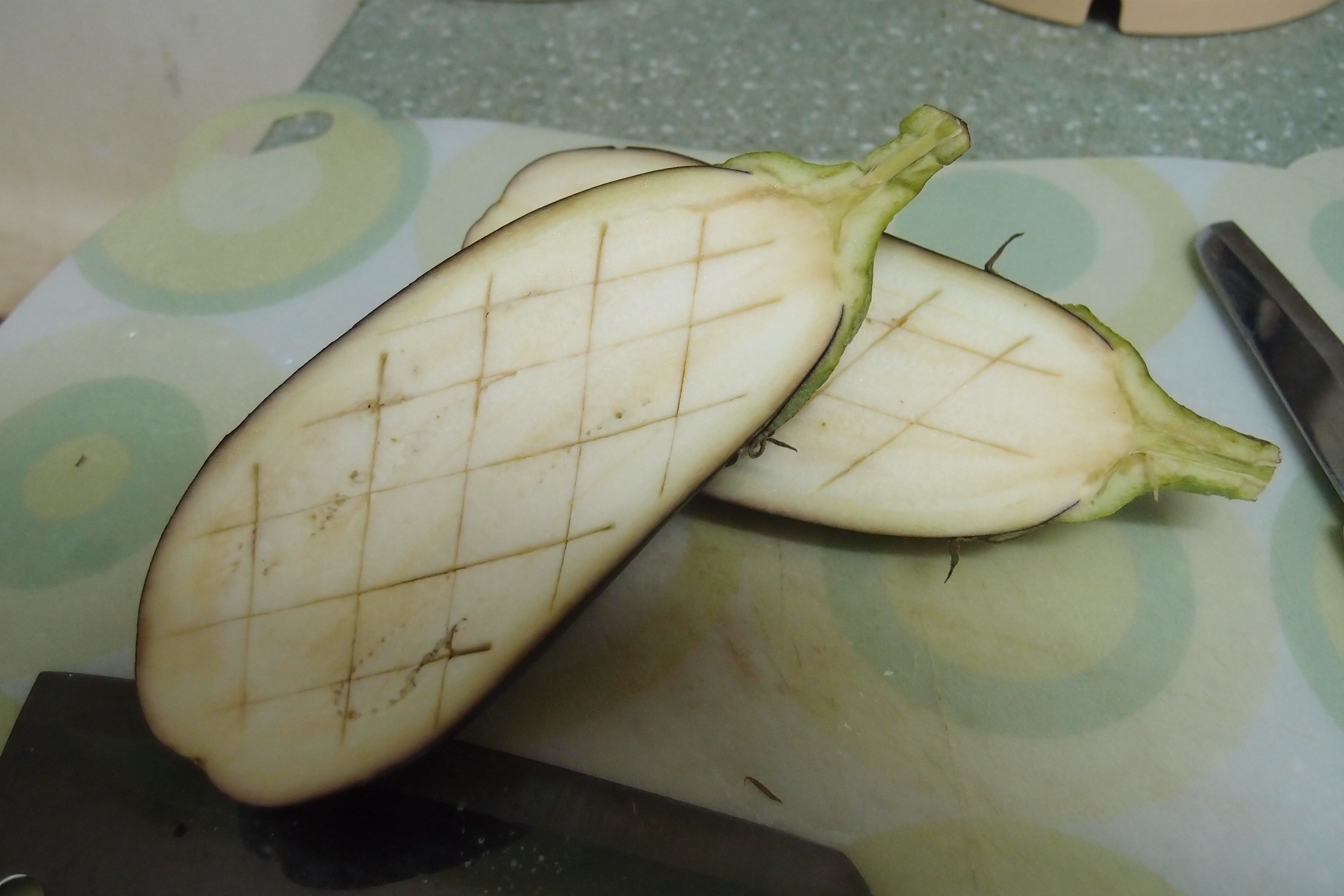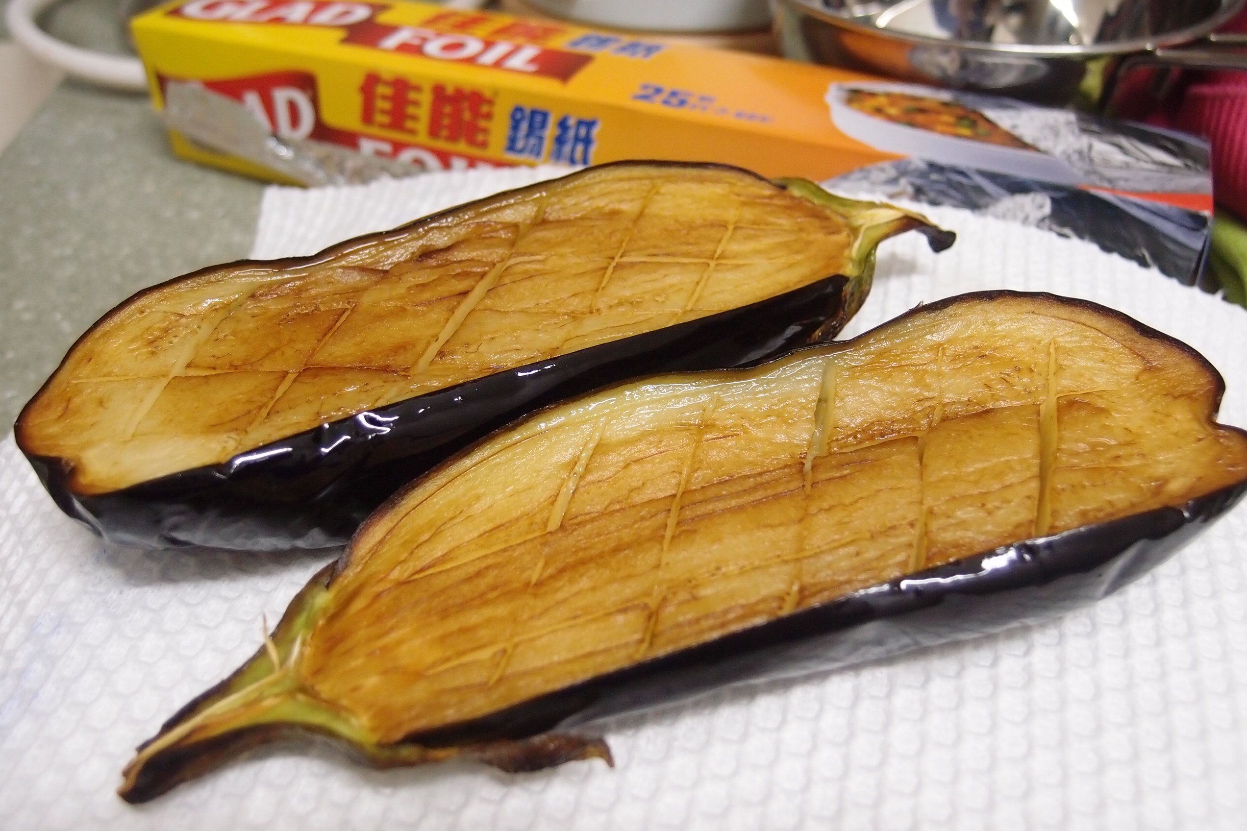 1)將茄子洗淨,切半,在茄子肉上面界上井字的圖案。再用廚房紙巾將茄子的水份吸乾。