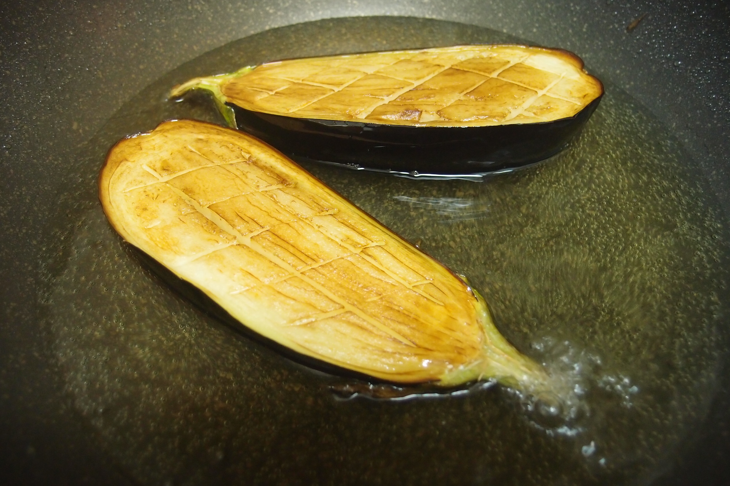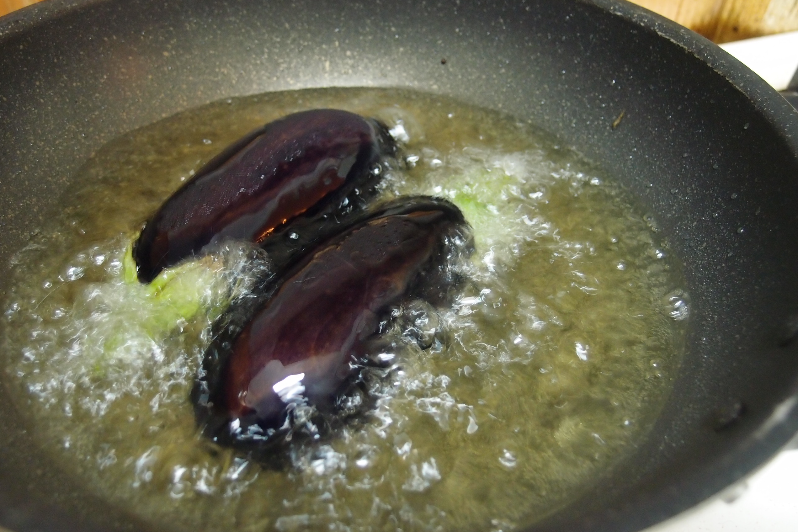 2)燒熱一鍋油,以中火將茄子炸至金黃色。記著要先炸茄子肉的一面,炸至金黃,再反轉將茄子皮一邊略炸。