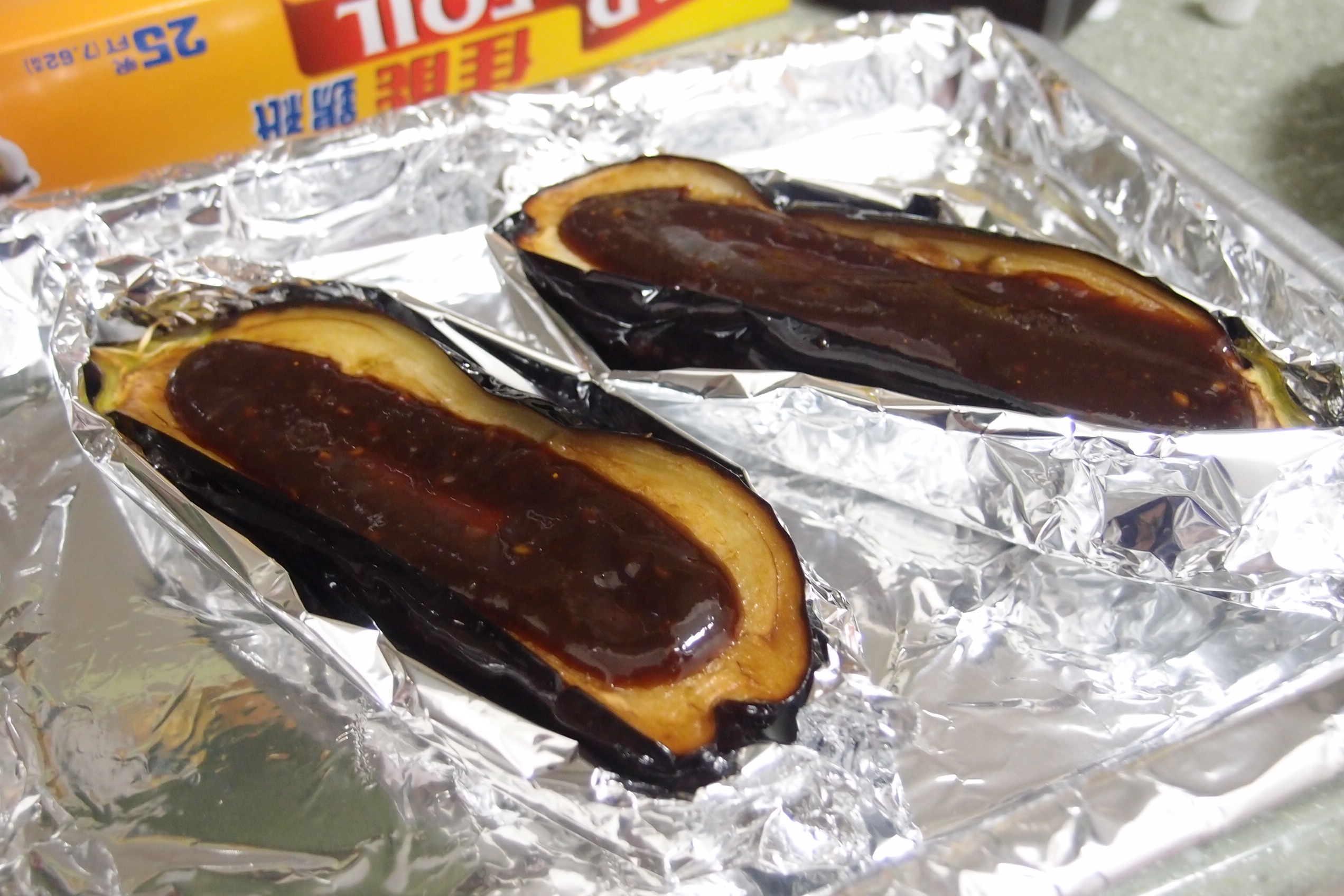 4)再用鍚紙將茄子的底部包好。