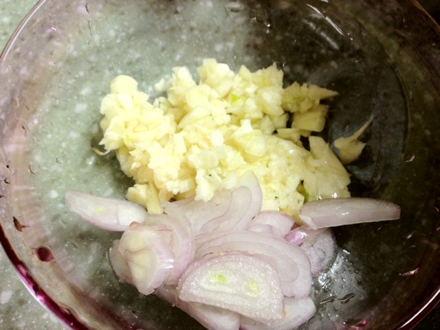 1) 先將蒜頭切成蓉, 乾蔥切片。