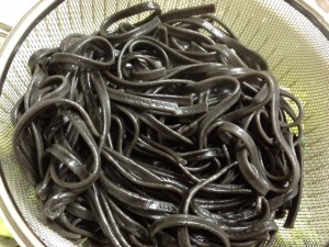 4) 墨汁扁麵依然包裝上的指示煮熟, 隔水備用。