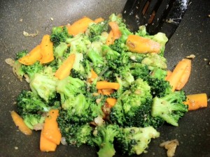 2) 將紅蘿蔔片加入, 中火炒至半軟身, 再加入西蘭花略炒。
