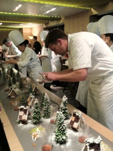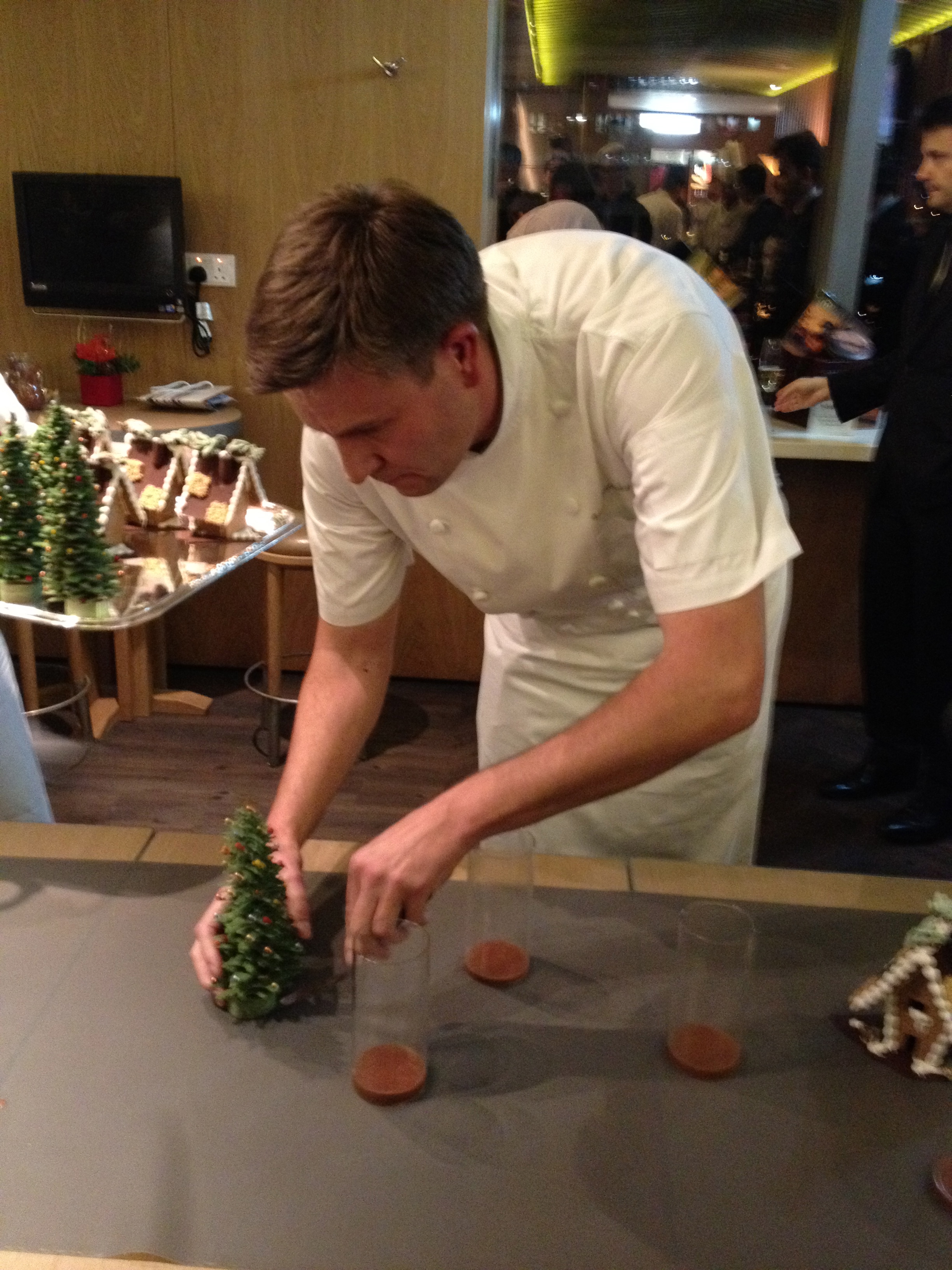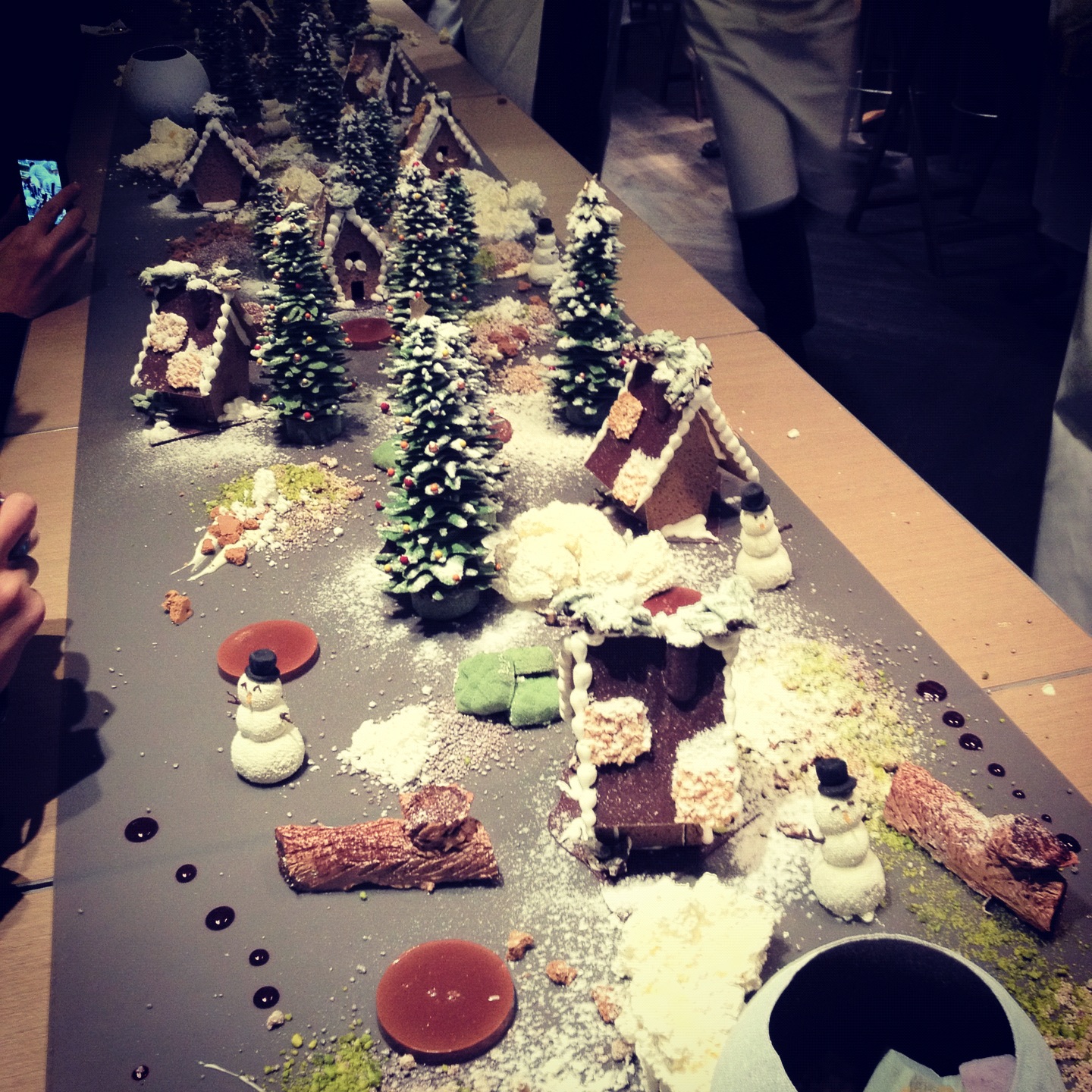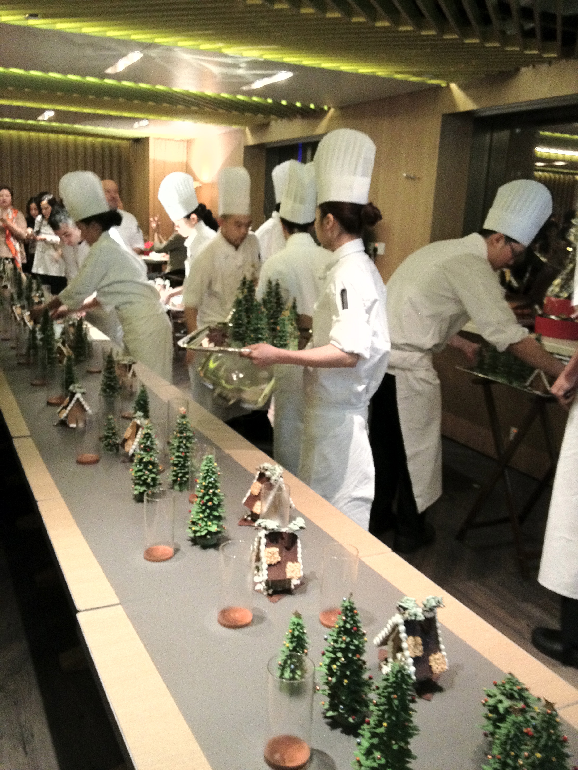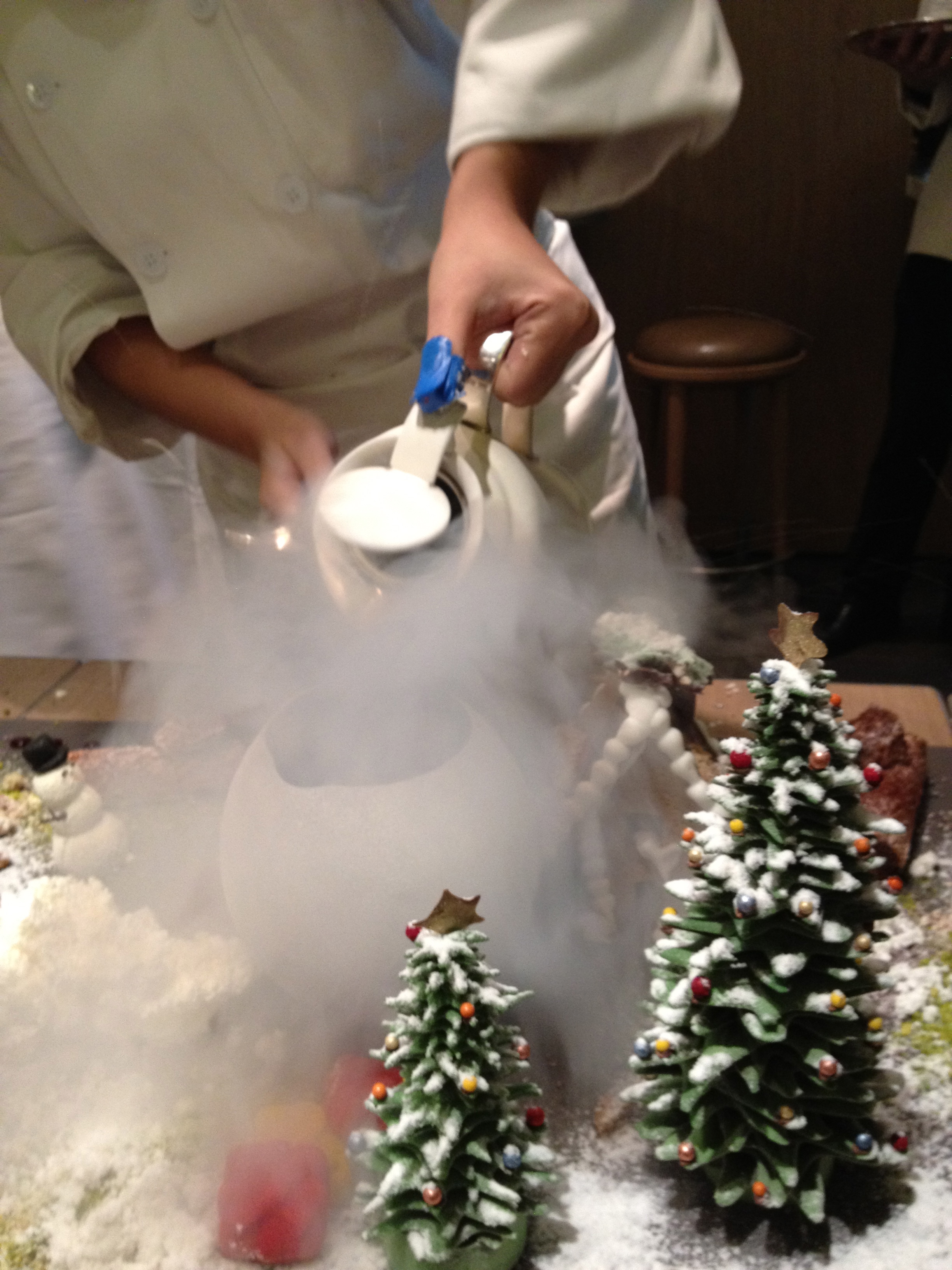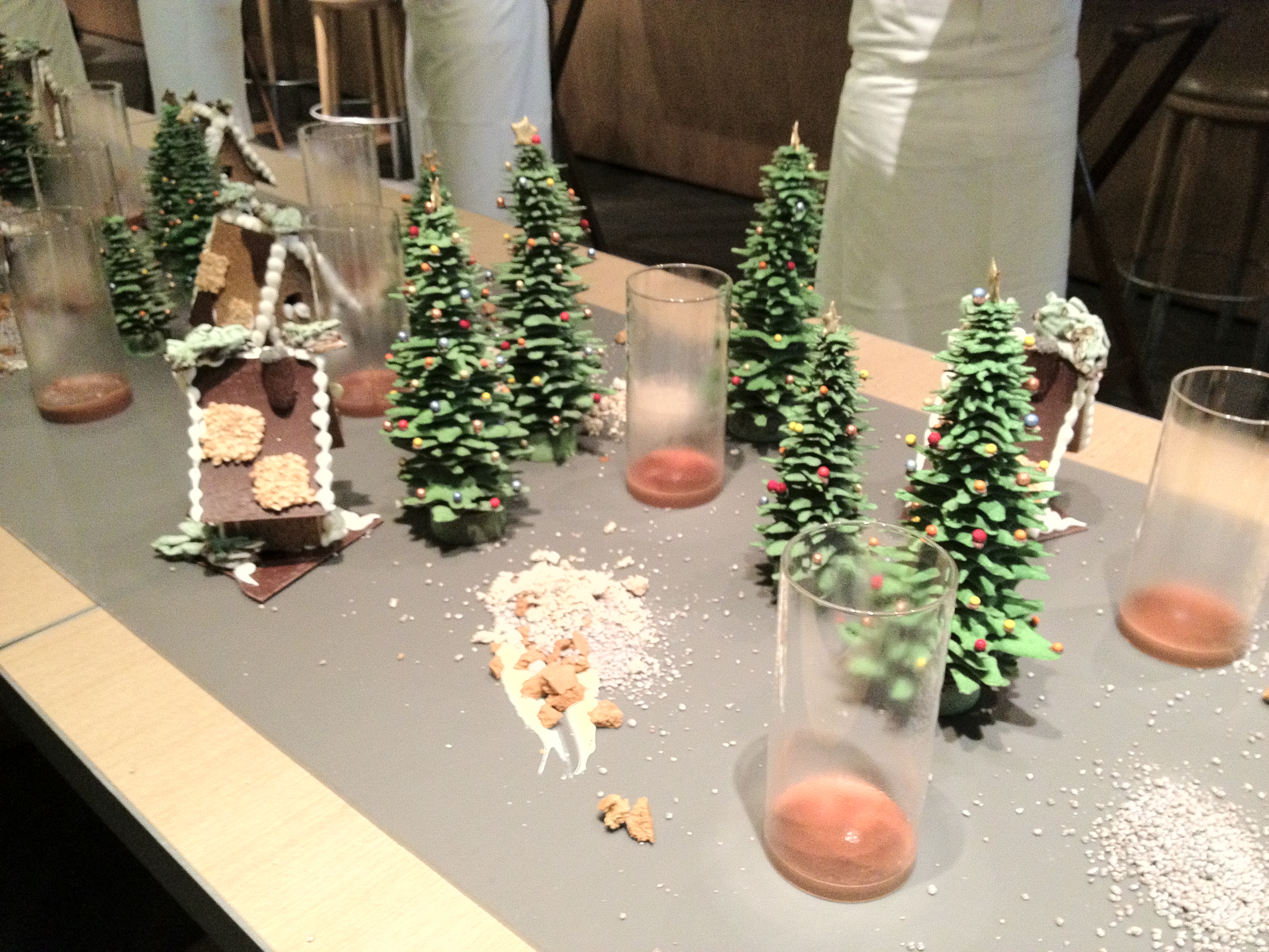 見到Chef Uwe和他的團隊即場示範的甜品叫Winter Wonderland, 一邊看他們將聖誕樹, 薑餅屋, 雪人放在檯上, 又倒又灑不同的材料, 有cream有開心果碎有糖粉, 令在場的guest都嘆為觀止, 歡呼聲不斷。