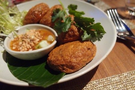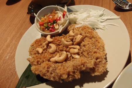 泰式炸魚餅,魚餅炸成金黃色,吃落幾彈牙,魚味也不俗, 每口吃到淡淡的檸香, 很泰式的味道。雖然吃什麼最好也是趁熱時吃最美味,不過也要提提大家,這個真的一上檯就要吃,不要放得太涼,原因放涼後,真的吃到有點腥味。甜辣醬裡面加了些青瓜粒,平衡一下炸魚餅給人很油膩的感覺。