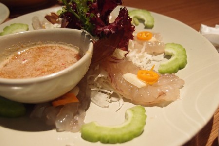 吃泰菜怎少得生蝦呢?!這裡的生蝦,一碟有八隻,每隻也伴上生蒜片及辣椒,還伴上酸辣汁,是傳統的吃法!生蝦也算新鮮,肉質幾爽,但略嫌不夠鮮甜。而酸辣汁絕對是亮點,酸辣度適中,還加了香茅,很香。我的習慣是吃完生蝦,通常也覺辣(因為辣椒仔跟生蝦一起吃嘛!),所以我會再吃伴碟的生苦瓜來清一清味蕾,幾有效的!