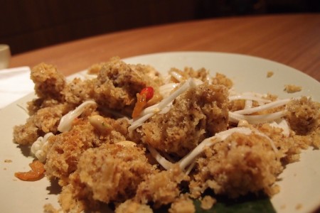 香脆鯰魚伴青芒果沙律~ 這道沙律,先將鯰魚拆骨起肉,做成魚鬆, 再拿去炸。吃的時候, 先將鯰魚用刀叉拆開, 跟青芒果絲拌好, 加入醬汁一起吃。鯰魚鬆炸得鬆香酥脆, 又不油膩, 魚香四溢, 跟酸酸甜甜的青芒果絲一起吃, 實在是不錯的配合。個人覺得醬汁太少, 我們去吃的時候, 還要Encore多一個醬汁呢~