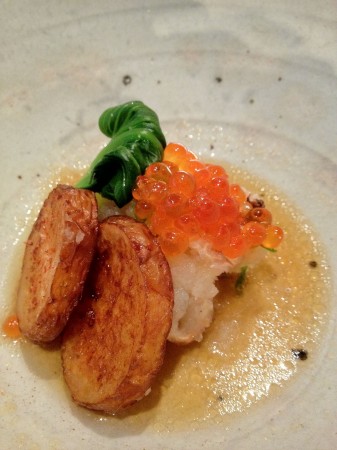 頭盤我選了這個帶子和蝦的沙律,看起來不像有帶子和蝦,本來還以為是上錯東西給我。不過想起是fusion,心想還是拍完照在把它弄開再看看,比較穩陣,無謂樣衰啦。果然,帶子和蝦的刺身藏在蘿蔔蓉裡面,沙律汁是最簡單的柚子酸汁。蘿蔔味道重,夠清甜,不錯,跟帶子或蝦再伴柚子酸汁一起吃,很對我的胃口呢,十分開胃。不過那兩片烤薯,放涼後,卻變得韌了。
