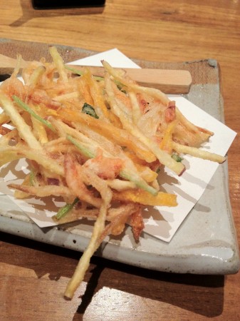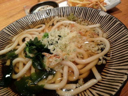 因為天氣比較冷,主菜方面我沒有多作什麼考慮,只想吃點熱的東西,所以想也不想便選了這碗熱烏冬伴什菜及蝦的天婦羅。烏冬上檯時夠熱,不過,請容我衰少少講一句:那些烏冬跟大家在超市或街市也可買到的噹噹烏冬,是沒兩樣的!!!烏冬有點粉粉地,一點煙韌感也沒有,非常失望,我想我付這個價錢吃的烏冬,應該不是這樣的質素吧?幸好,這碗不吸引的烏冬,有一個亮點,就是在於那一丁點柚子胡椒及櫻花蝦,將它們拌勻跟烏冬吃,即時醒神百倍,加快我把烏冬吃完。