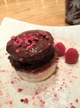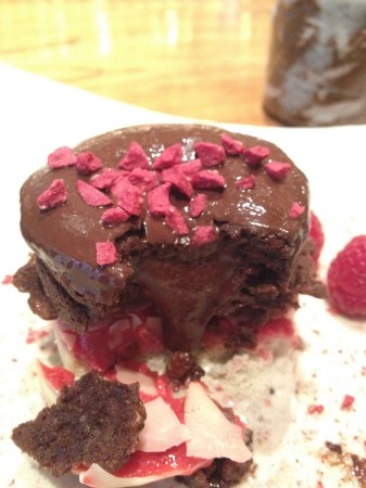這個Set是沒有包甜品或是咖啡的,還記得上次來的時候,甜品是最讚的,所以還是決定叫甜品來吃呢!上次吃過那個清酒浸桃的甜品很讚,其實今次也想order的。不過這天的天氣太冷,盡量也想吃些暖暖的東西,最後還是選了熱朱古力蛋糕配紅桑子焦糖香草脆($138)。記得上次叫這個朱古力蛋糕,是沒有流心的,挺失望。幸好今次也算不錯,最少蛋糕是暖的,是流心的,是濃濃的朱古力味,底層的焦糖香草脆脆包著輕盈的紅桑子慕絲,平衡了朱古力的味道,這個組合,是很配的,挺不錯的。是我喜歡的一款呢~哈哈!