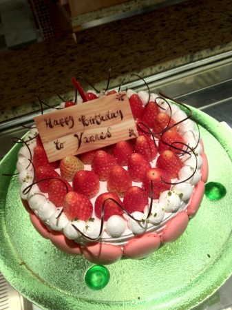 生日當然有生日蛋糕,也是在酒店裡的餅店訂的,是士多啤梨慕絲蛋糕。這個是妹妹的特別要求,要有勁多士多啤梨及馬卡龍做裝飾,餅房方面,通通做到,真的要讚~慕絲細膩夠滑,入面夾著一層軟軟的海綿蛋糕;新鮮的士多啤梨每粒都非常甜,馬卡龍不是太甜的一種,大人小孩都吃得到!