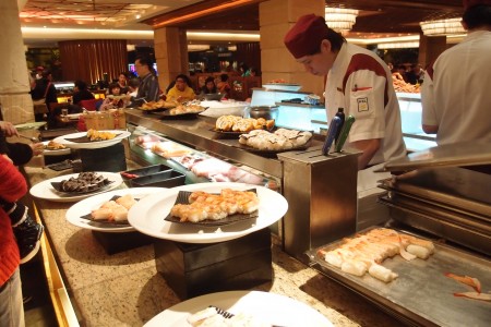 壽司﹑刺身是自助餐必有的環節,這裡壽司款式多,小朋友們很愛吃。不過刺身一般,雖然三文魚幾好,尚算肥美,不過(魚立)魚就好像魚肉太腍,味道不夠鮮。