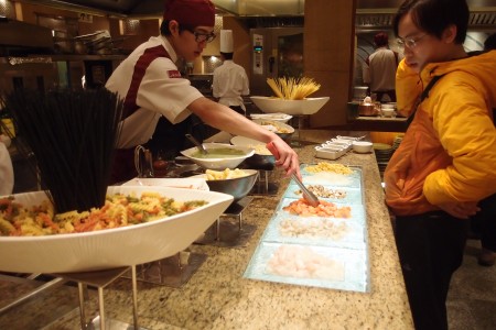 熱盤方面,除了一般有的普通菜式外,還有現場即煮意粉、粉麵、粥也有。我試了即煮的Rigatoni,本身有不同的海鮮選擇,但我只選了番茄汁及洋蔥碎,Rigatoni做到al dente,以自助餐來說,做到這個水準,很難得。