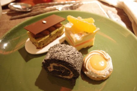 因為預備了生日蛋糕,所以在 十多款甜點中,最後選了這些。綠色那件是開心果蓉香橙朱古力餅,開心果味濃,隱若也能吃到開心果碎,不過朱古力味裡吃不到橙味,如果叫做開心果朱古力餅好似比較貼切;有兩件橙在頂層的那件是橙味西柚慕絲蛋糕,慕絲好滑,橙味夠香,但又有剛才開心果蛋糕的問題,說是有西柚的蛋糕,卻沒有西柚味道;黑色那件是竹炭紅豆卷,媽媽吃完也讚不錯,蛋糕幾鬆軟,是粒粒紅豆,難得是不太甜;剩餘那件是檸檬蛋白撻,酸酸甜甜,幾清新,四件餅之中,最喜愛都是這件了,都說我是一個不折不扣的檸檬控啦。
