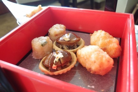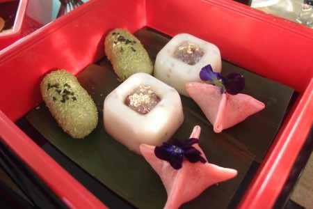 底層是冷的甜點,有燕窩杏仁紅豆凍(圖中)﹑芒果綠豆蓉糯米角(圖右)及綠茶椰蓉棗(圖左)。先說說芒果綠豆蓉糯米角及綠茶椰蓉棗,兩者的配搭是不俗的,但既然用得的都是糯米皮,為什麼一點也不軟糯不煙韌,我想這是最基本的口感吧!放進口裡,咀嚼幾口,口感卻是粉粉的。中間的燕窩杏仁紅豆凍,是最正常的了,賣相更是相當精緻。杏仁凍裡面有西米,朋友說略嫌西米太腍,但對我來說是OK的,不過杏仁奶凍吃不出有杏仁味,應說是很薄弱的杏仁味。