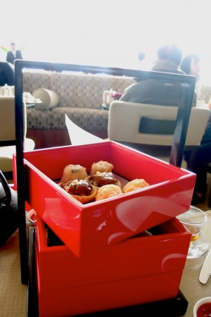 中式下午茶跟英式的也是三層,不同的就是以一個很的骰的紅色盒子上檯,非常有新年氣氛,這個中式tea set更有另一個名字叫The Red Box。