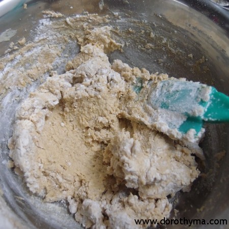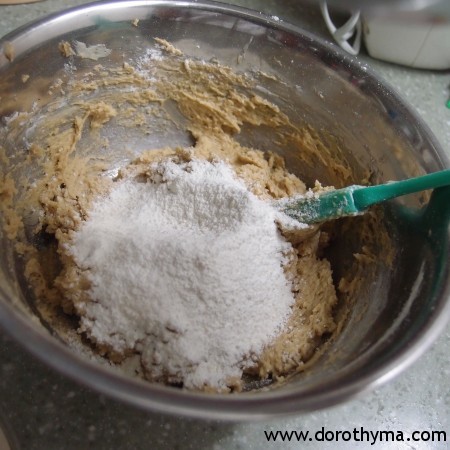3)分兩次加入已過篩的麵粉拌勻成麵糰。
