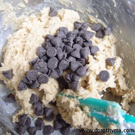 4)將入爐用朱古力粒加入麵糰拌勻。
