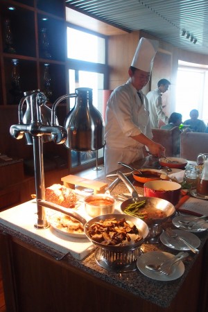 這次來吃Sunday Brunch,跟在香港的很不同。在香港吃Sunday Brunch,其實跟去吃自助餐沒分別,都是一盤盤食物煮好,放出來給客人自取。這裡最大特色是,當你走進用餐區,會見到一個個煮食櫃台,有廚師即場為客人煮餐,很特別。現場即煮的食物,當然除了冷盤及甜品是例外吧!