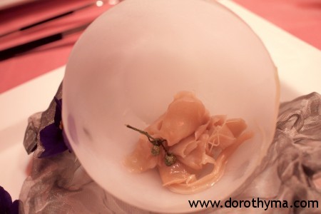 先來一味「鮮花椒熗加蚌」,賣相一流,以冰做成一粒珍珠,裡面放著稍稍灼過的象拔蚌片,非常優雅!蚌片有冰珍珠冰鎮著,入口清涼可口,味鮮甜,加上帶少許麻辣的花椒味。一道看上去似是平平無奇的菜式,味覺上卻有多重層次!