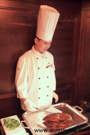 吃完海參,到今晚的主角 - 大董「酥不膩」烤鴨!師傅將烤鴨拿到我們跟前,即場為我們「片鴨」!