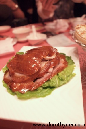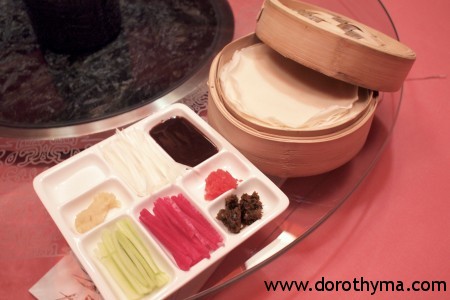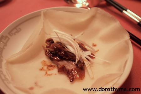 第二種吃法就是在香港最常見的,薄餅包著鴨肉及配料,加點甜醬包著吃!醬汁及配料一人一份,自己選喜愛的配料,就算放得多也不怕將別人的份量吃掉。哈哈!薄餅做得超薄,有麵粉香氣,薄得來有質感,是我去吃過烤鴨時最好的薄餅!鴨肉夠嫩,肥油不多,女生多吃幾件也不怕肥!