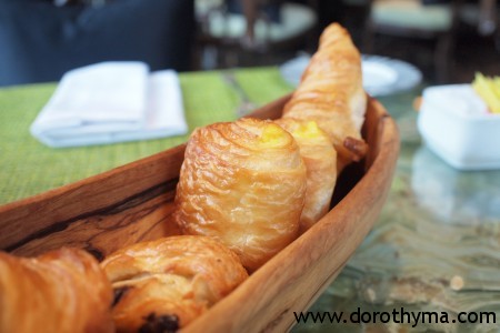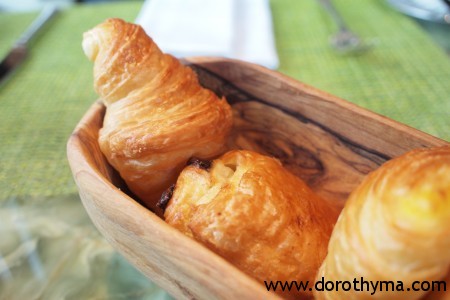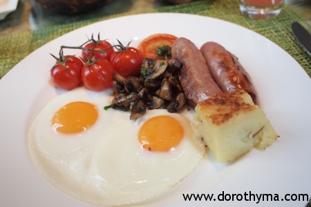 這次旅程的第一份大早餐,點了英式早餐、西柚汁、多士及咖啡。點餐才不過五分鐘,店員已拿來一個Pastries Basket,放著三種不同的Pastries,有牛角酥、朱古力酥及奶黃酥。這些酥拿上手時,還是暖暖的,讚喔!既然這麼讚,我一口氣吃了三件不同的,這些crossiants真的做得不錯,酥面脆脆地,內裡夠鬆化,牛油香滿瀉!(我知,是很肥的,但我豁出去了!)平常大多是吃牛角酥及朱古力酥,這次吃到奶黃酥是幾驚喜的,奶黃做得不太甜,但吃到蛋黃的香,三款裡面最愛這一款呢!